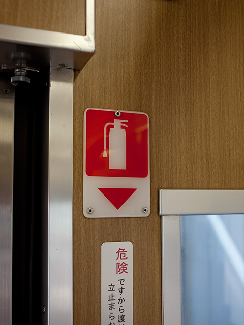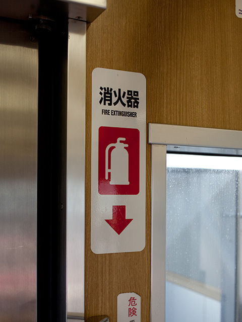 - 「消火器案内」は車椅子スペース部分に収納された消火器の案内表示のことです。それ以外の場所は本体が露出しているため、設置場所を示す表示はありません。