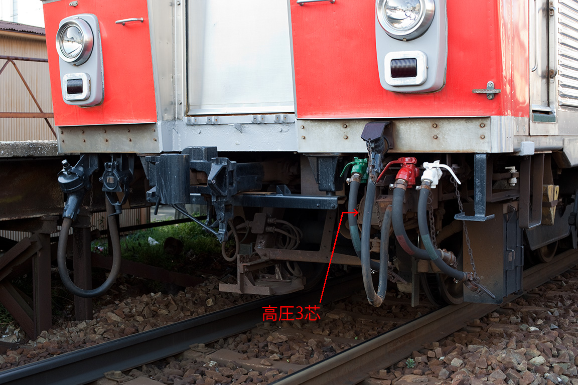 ちなみに新豊橋方先頭車のク2800形は、上田電鉄から譲渡されたク2810のみ高圧3芯の栓受けを搭載していないほか、2007年頃にク2808の高圧1芯の栓受けが撤去されています。こちらは1両だけで追随する車両は現れていない事から、何らかの事情で当該のみ撤去せざるを得ない事情があったものと推測しますが、詳細は不明です。