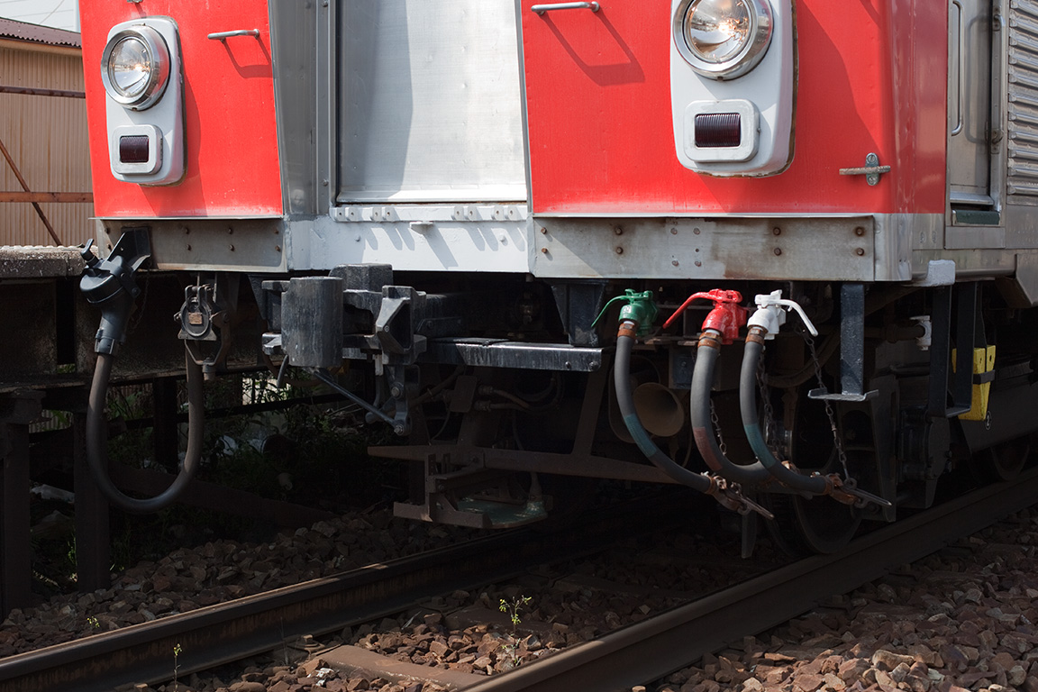 東急7200系は、最大で4つの電気連結器を装備していました。海側に母線である高圧1芯ジャンパ(IC1Z型、あるいはKE-6型とも)と低圧55芯ジャンパ(IC-70型)、山側に冷房用三相の高圧3芯ジャンパ(IC3A型)と低圧27芯コネクタ(YL3-27型)といった具合で、デハ7200形のうち先頭に連結された車両の正面は、低圧55芯と27芯コネクタが常時ケーブルを接続した状態で運用されていました。