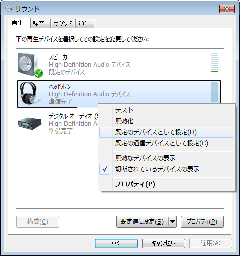 - 「再生」タブの「ヘッドホン」を右クリックなどでコンテキストメニューを表示し、「既定のデバイスとして設定」を選択