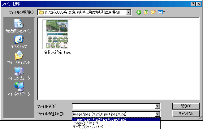 の4種類が考えられますが、Opera以外はいずれの場合においても何の変化もなし、つまり未対応のようです。Opera9は、「ファイルを開く」ウィンドウにおいて、「ファイルの種類」のデフォルト値がaccept属性で指定したものになります。