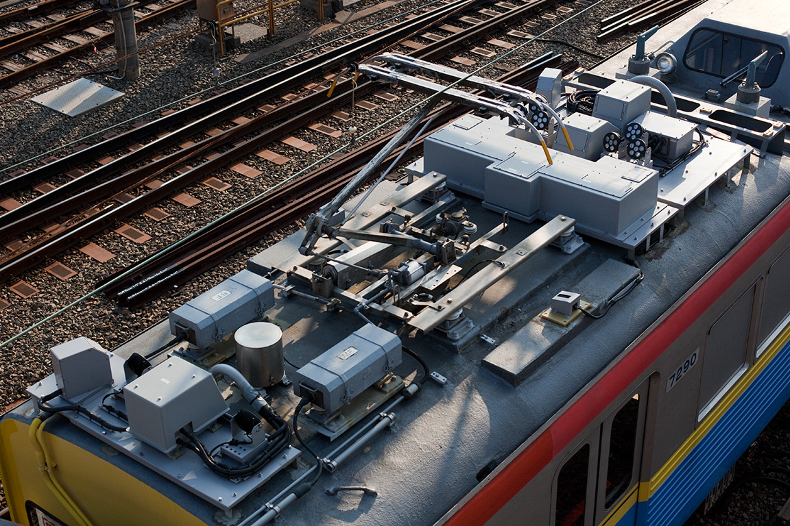 さて、書く機会を逃していましたが、デヤ7290の架線検測装置が2010年に更新されています[1]。この装置は明電舎が数年前に開発したCATENARY EYE(カテナリー アイ)(www.meidensha.co.jp)と呼ばれるもので、車両の屋根上に各種カメラや照明、センサーを配置して、トロリ線やパンタグラフの動きを画像解析するもののようです。