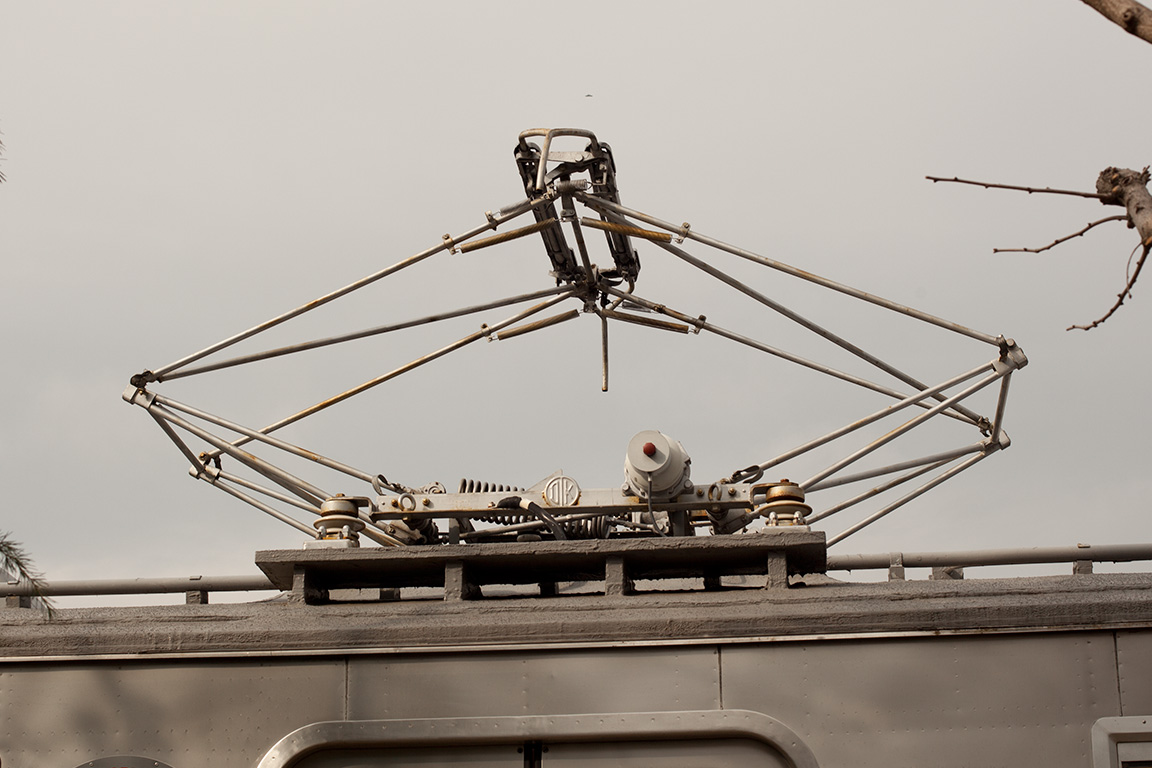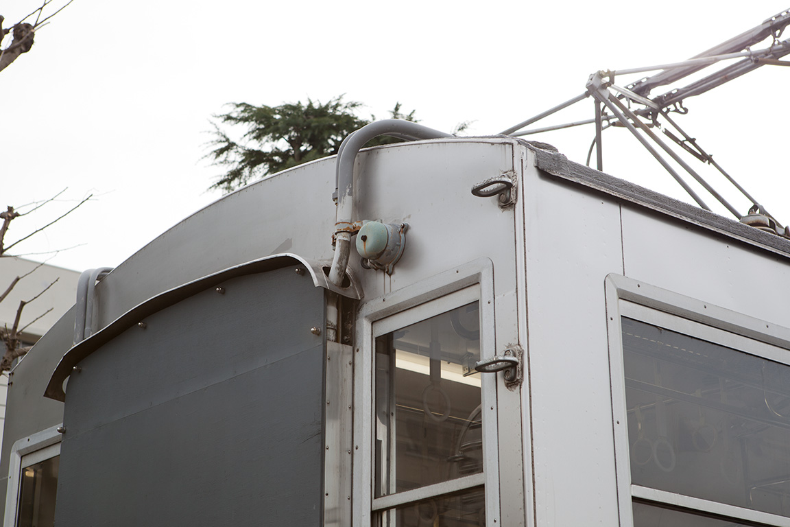 謎なのがパンタグラフで、ホーンが末端で結合しているタイプとなっています。東急時代末期は、現在の7700系のように末端まで2本のタイプとなっていたのですが、東急車輛に来てから交換したのでしょうか。台枠には怪しげな機器が付いており、避雷器も撤去されるなど好奇心をそそられます。