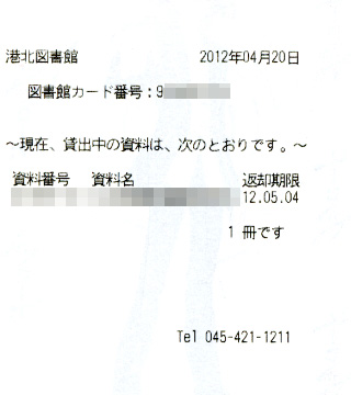 本を借りたときにレシートを渡されますが、そこには資料名などとともにカード番号が記載されています。