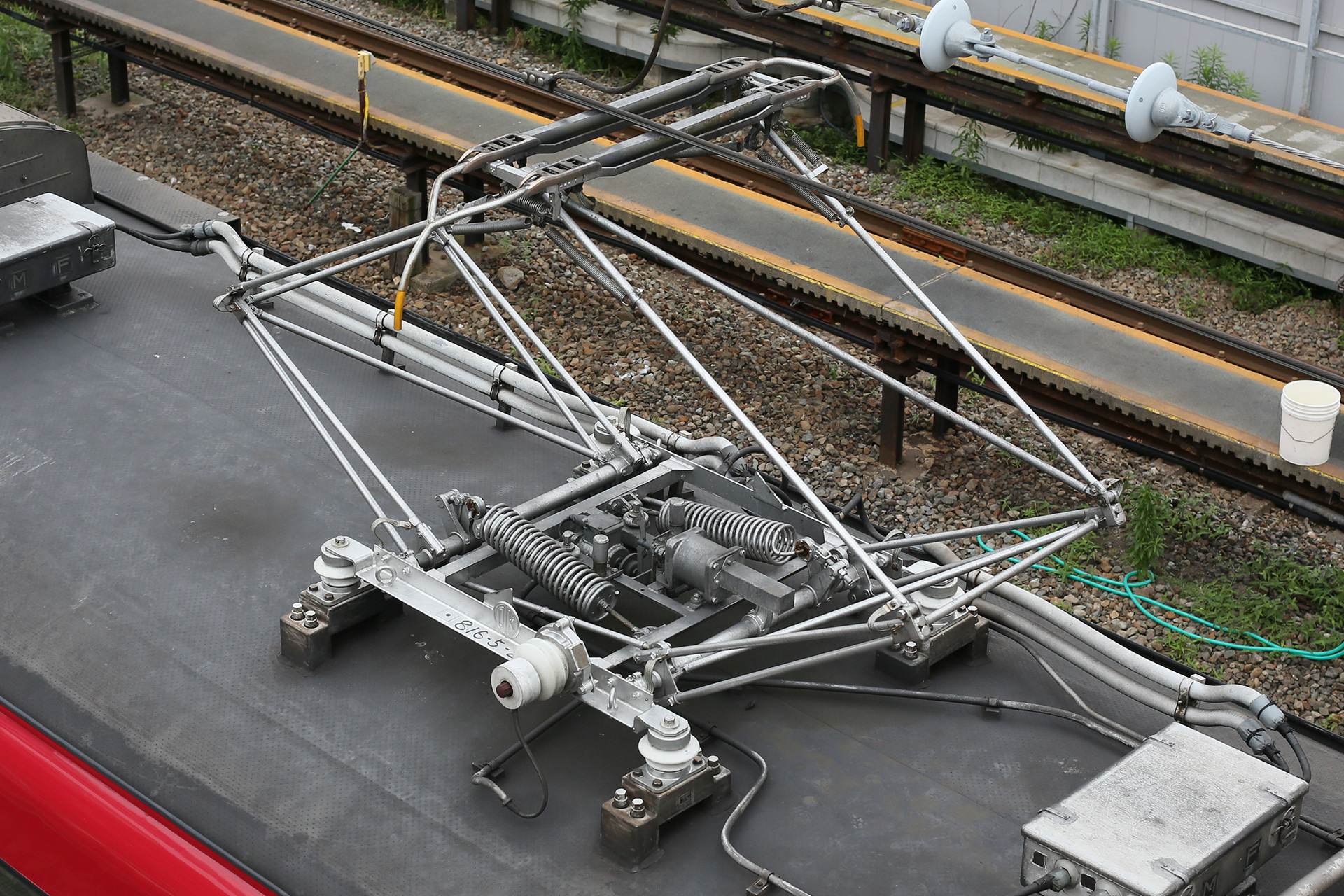 謎なのがパンタグラフで、ホーンが末端で結合しているタイプとなっています。東急時代末期は、現在の7700系のように末端まで2本のタイプとなっていたのですが、東急車輛に来てから交換したのでしょうか。台枠には怪しげな機器が付いており、避雷器も撤去されるなど好奇心をそそられます。