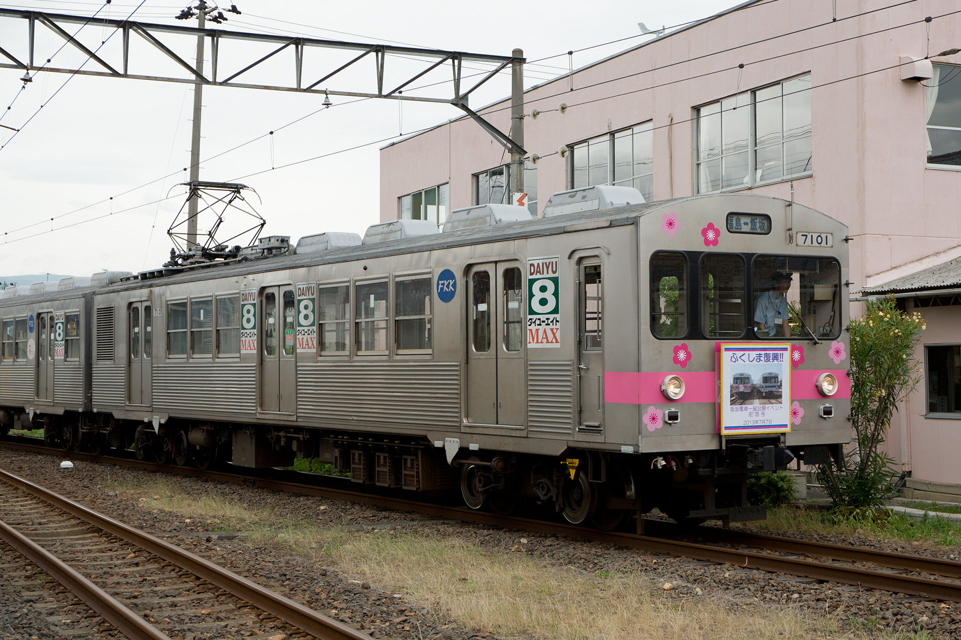 なお、本日7月7日は桜水車庫で飯坂電車一般公開イベント(www.fukushima-koutu.co.jp)があった関係で、臨時列車に使用された7101-7202に特製ヘッドマークが掲出されました。
