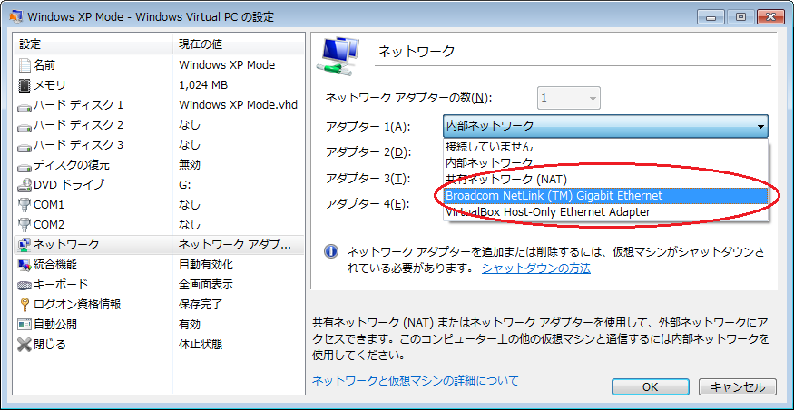 XP Modeのネットワーク設定については、起動後の「ツール」→「設定」で設定画面を開き、「ネットワーク」の「アダプター 1」のところをLANデバイスのものに変更します。