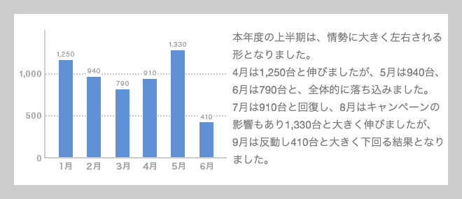 それに、グラフは人間が目で見るためだけのものではありません。ウェブという媒体が、テレビや本などと大きく異なる点のひとつに、機械可読性に優れている面があります。「4月は1,250台と伸びましたが、5月は940台、……」という日本語の文章を機械的に判断するには高度な言語解析技術が必要でしょう。
