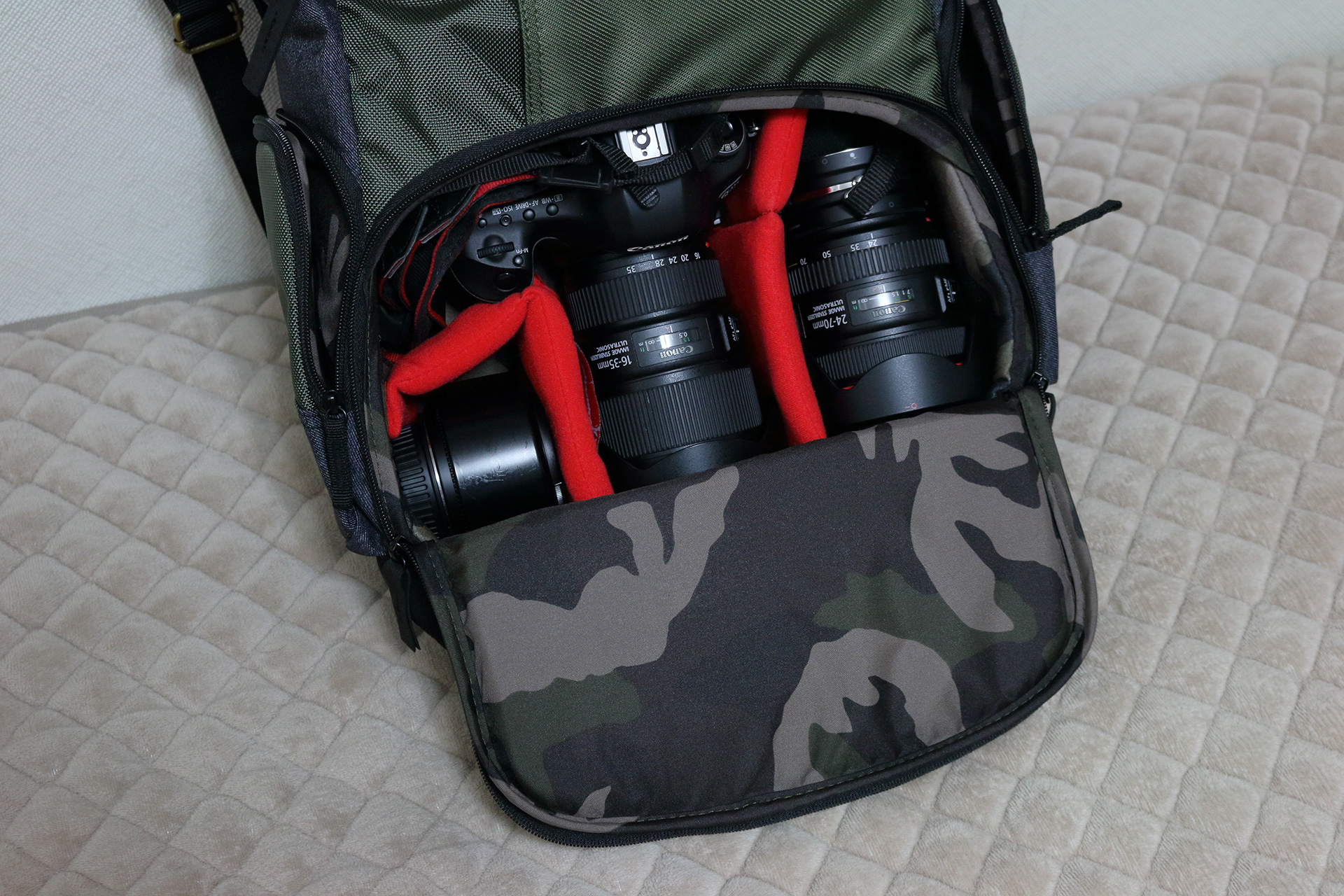 写真はフルサイズ一眼レフにF4通しのズームレンズ2本、単焦点50mmを1本収納した様子です。