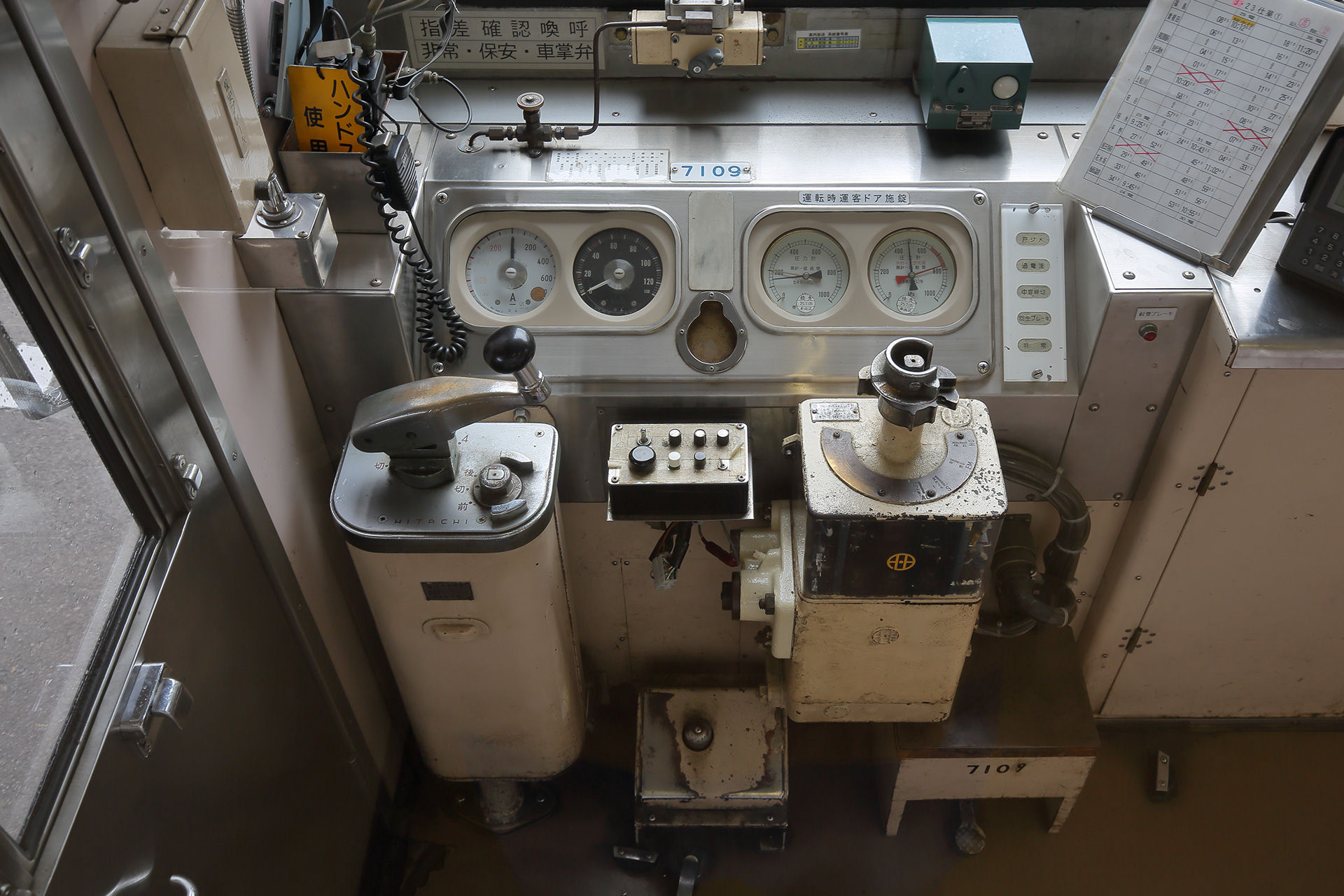 また、飯坂線の7000系は主制御器などの主要電装品が東洋電機製造のものですが、今回引退する2両を含む6両[3]はマスコンハンドルが日立製作所製となっています。1991年の譲渡の際に先頭化改造で運転台を新設するにあたり、在庫の関係でそうなったのでしょうか。なお、同様に電装品とマスコンのメーカーが異なる例は上田交通に譲渡されたクハ7554[4]や十和田観光電鉄に譲渡されたモハ7305[5]があり、後者は今でも大井川鐵道で見られます。