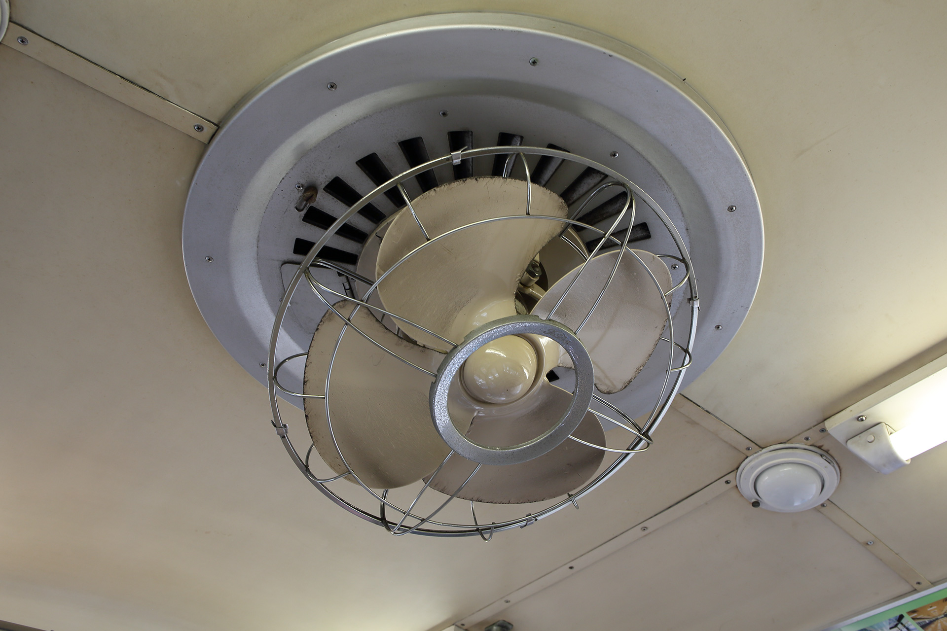 最大の特徴はなんといっても扇風機でしょう。福島寄りの先頭車デハ7109は、各地に譲渡された東急7000系の中でも数少ない、「羽根中央部が砲弾型」の扇風機を持つ貴重な車両です。
