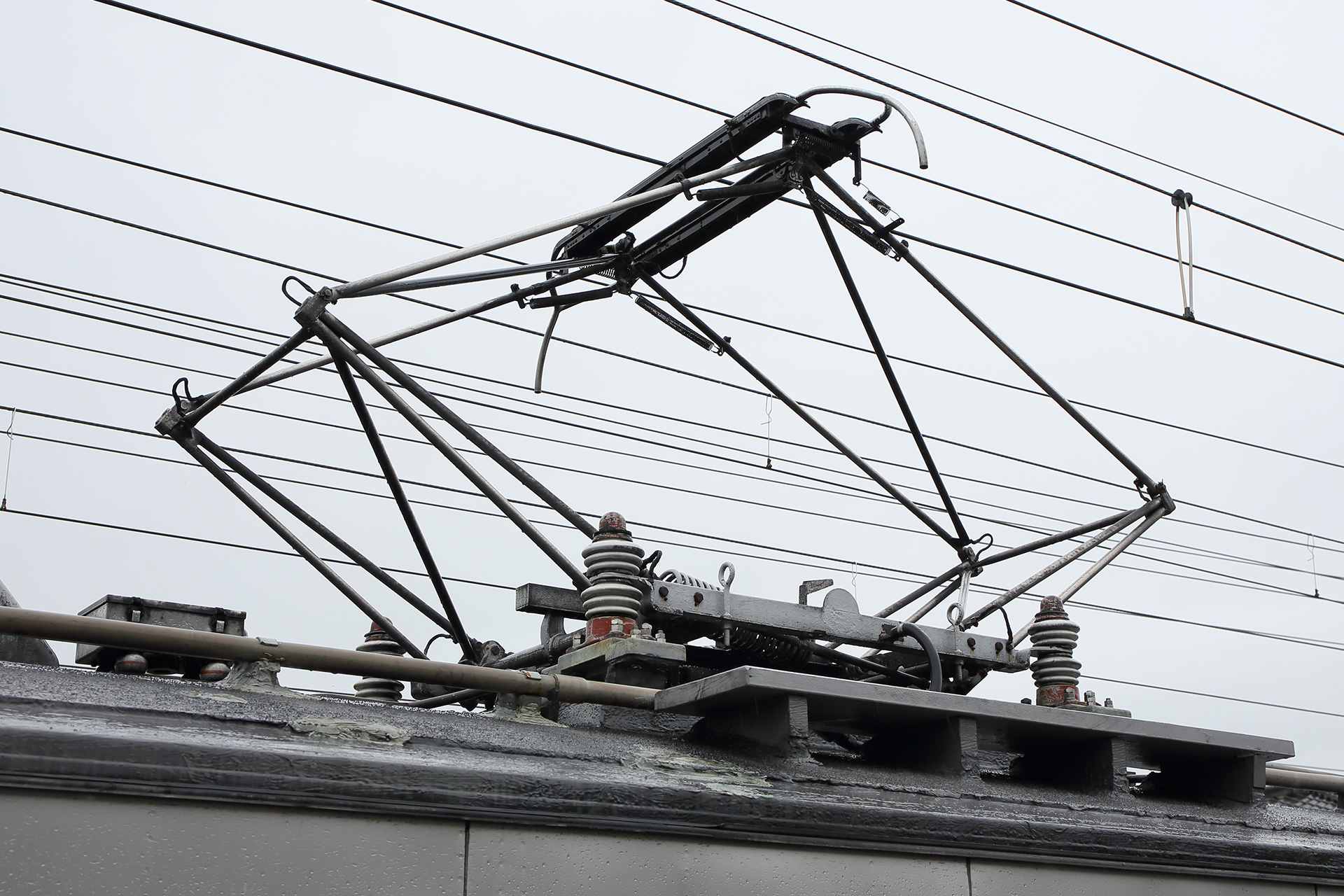 さらにデハ7109のパンタグラフは飯坂線では唯一、横控管が両側に備わっています。