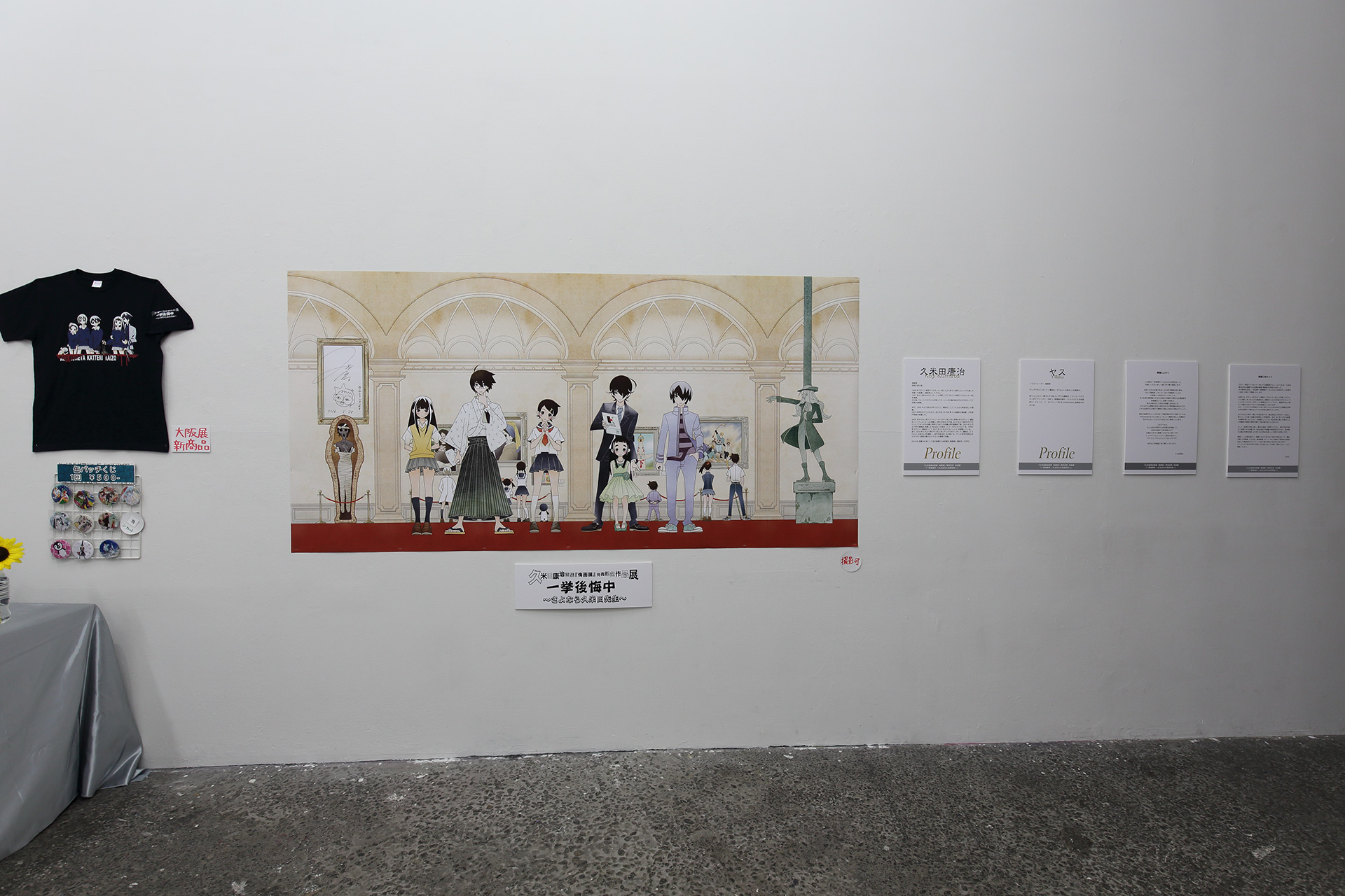 そこを抜けるとGoFaと久米田先生からの挨拶文、および久米田先生、ヤス先生のプロフィール紹介がありました。これは東京会場でも階段途中にあったものですが、挨拶文は大阪用に書き直されており、とくに久米田先生の方は関西の文化をネタにした文章で「紙ブログ」や「エセ エヌ エス(仮)」を読んでいるような感覚になります。