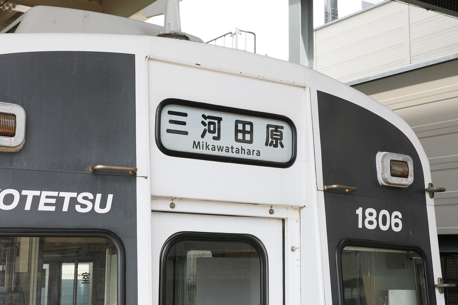 ちなみに、1800系の方向幕が変化したのはこれで2度目のことです。譲渡当初、一部の車両は「三河田原」の「三河」の部分のみ文字が小さいものを使用していましたが、2006年頃に4文字とも同じ大きさに統一されています。