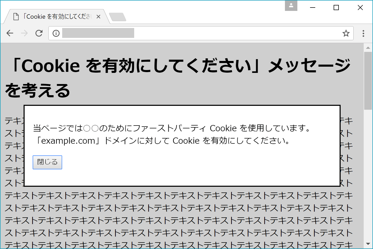 前提条件に書いたとおり、今回は「Cookie が有効でないと目的が達成できないシステム」を想定します。そのため、メッセージは必ず目に留まるようにした方が良いでしょう。一方で、ユーザーから「Cookie を有効にしないまま、そのページを離脱する」という選択肢を奪ってはいけません。