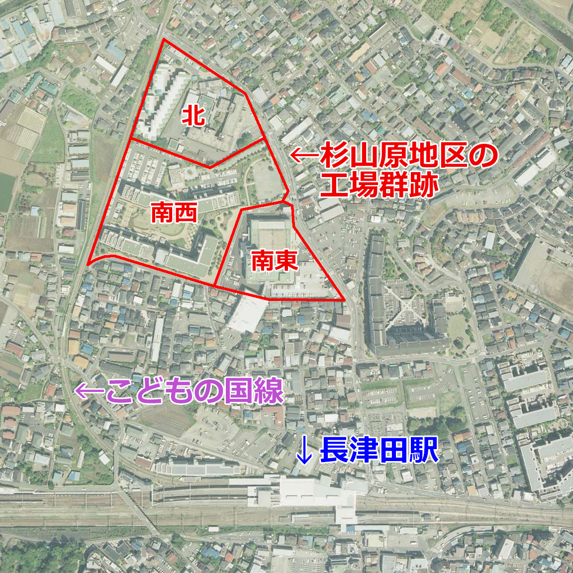mapps.gsi.go.jp)より、利用規約に則り転載。 - 図1で工場群の敷地を「北」「南西」「南東」の3つに区分けしていますが、これは本記事での説明のための便宜上な呼称です。また、境界線は正確なものではありません。