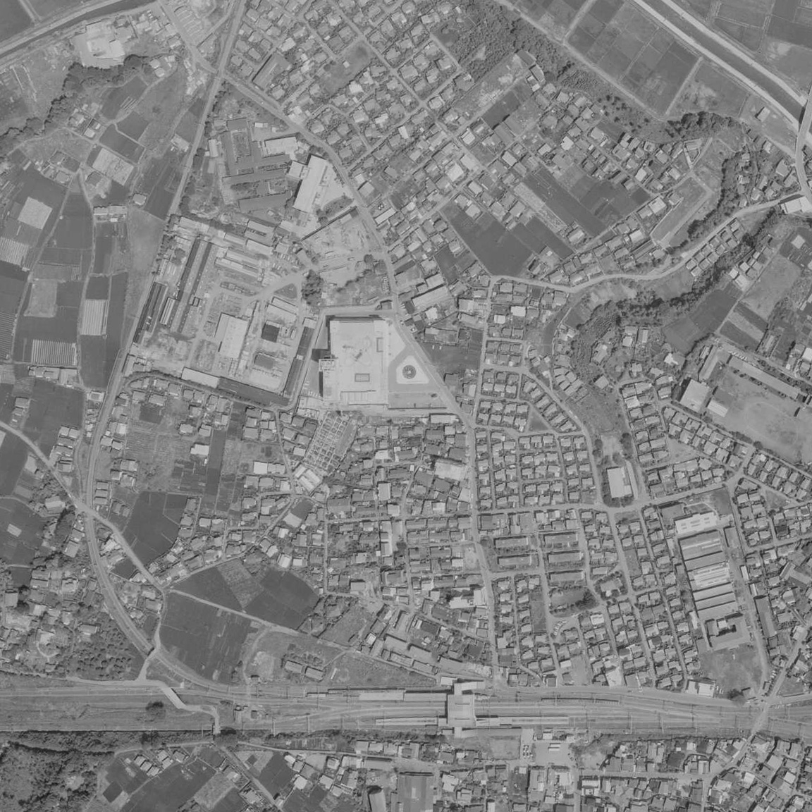 空中写真を見ると、南西敷地は東急建設が撤退して更地になるまでの20年間ほどの間に、線路沿いや敷地内の東側に建物が増設されていることも分かります。更地になった後は30年間ほど放置されていましたが、2002年には跡地にマンションが建設され、現在の姿になっています。