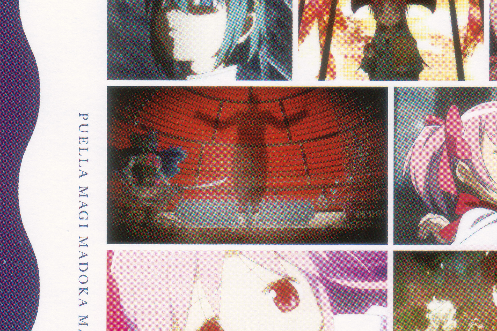 さて、そんな中もっとも衝撃を受けたのは歌詞カードに掲載されているTV版本編の画面ショットです。3話でマミに襲いかかる Charlotte が放送版な一方、9話で結界を出現させる杏子や、10話の「バカな私を助けてあげてくれないかな」のまどかがパッケージ版であるなど、どういう基準で素材を集めたのか気になるところですが、「06 Magia」の隣のページ、9話で杏子が Oktavia と対峙するカット(19m37sのカット)にご注目ください。