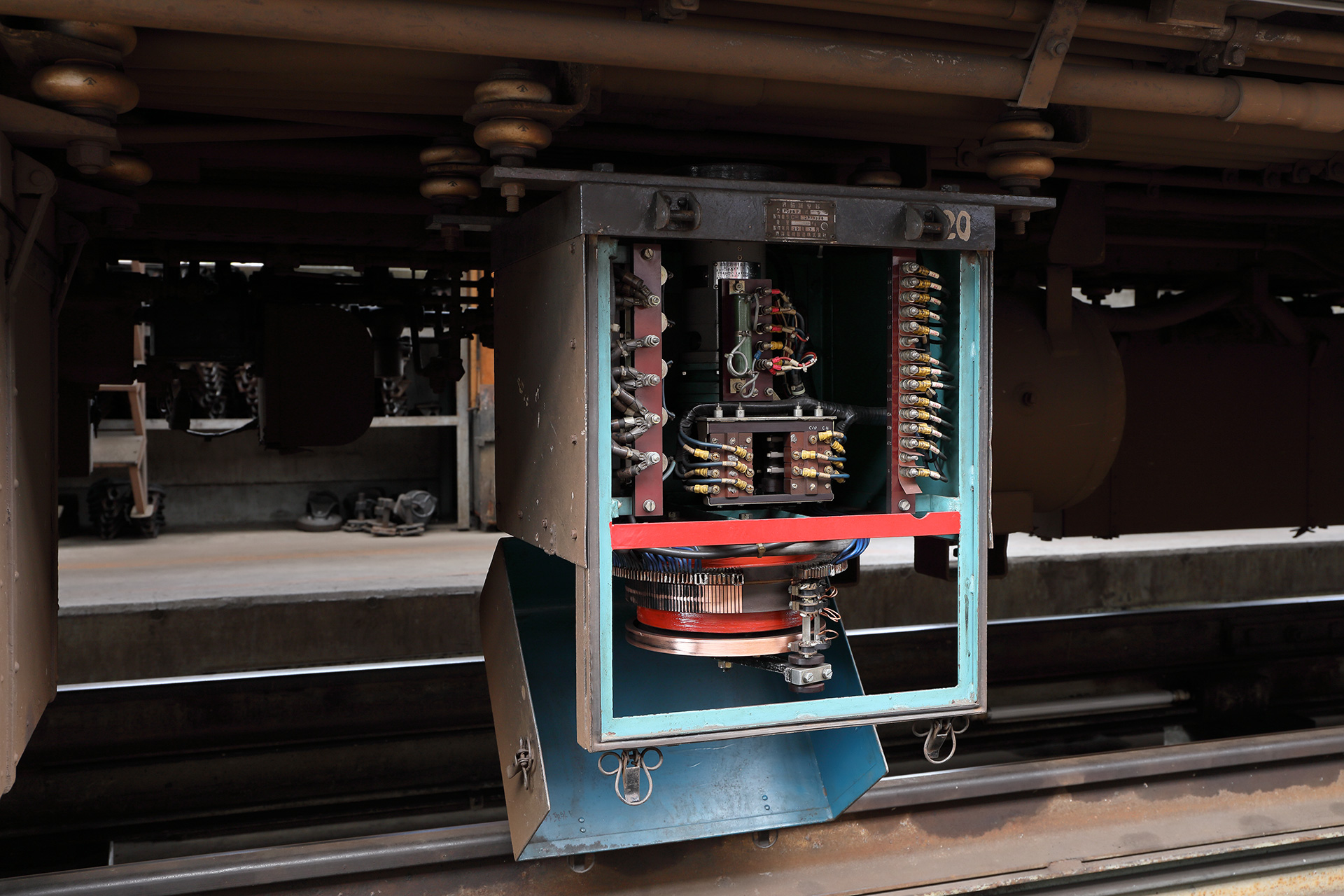 その後車庫に移動し、実車の床下を見ながらそれぞれの機器の解説が行われました。とくに7000系の主制御器や界磁調整器、1000系のVVVF継電器、ブレーキ制御装置などは機器の前蓋を開けて中の仕組みを説明していただけるなど、貴重な機会となりました。