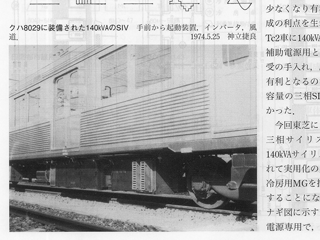 2019年3月14日追記 「電気車の科学」1974年8月号(No.316)(dl.ndl.go.jp)で特集が組まれていました。本文では諸元表や回路図込みで詳しく説明されており、またグラフページではモノクロ写真ながらSIV本体はもとより起動装置などの関連機器も含めて前面蓋を開けた写真が掲載されています。この本、所持しているのに長らく本棚の奥に眠ったままだったのですっかり忘れていました……。
