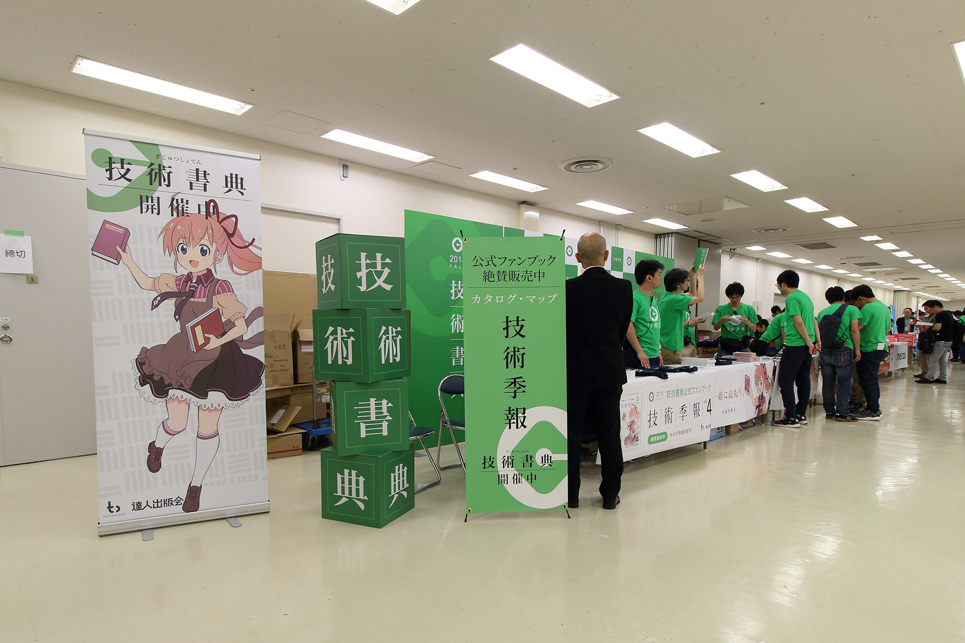 出口付近には立ち読み広場(blog.techbookfest.org)があり、周囲からは「入口付近にあった方が良い」という会話も聞こえてきましたが、個人的には出口付近で良かったと思います。結局、早くから来場する人は大抵お目当てのサークルがあって、最初はそこに行くでしょうから、立ち読みスペースが入口付近にあってもいったんはスルーするでしょうし、逆に待機列が解消された後は入口、出口の区別なくどちらからでも入退場できるようになりましたから、午後にふらっと来てまずは立ち読みを……という方は出口から入場すればいいので。