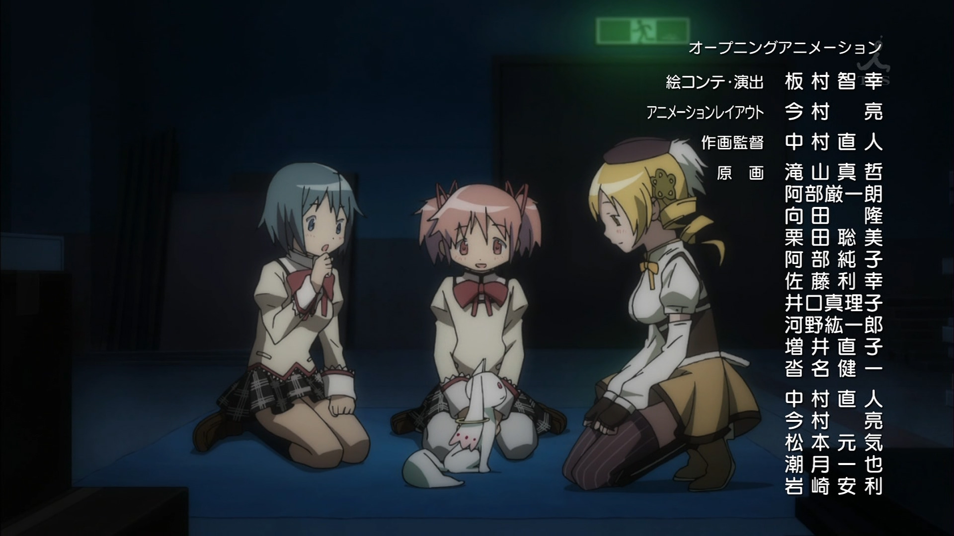 2011年の本放送では、まどか、さやか、マミがキュゥべえを取り囲むようにしゃがんでいるカットにクレジット表記が被さっています。パッケージ版ではエンディング「また あした」が追加されたためにクレジットは削除され、またマミとさやかの大きさが小さく修正されています。今回の再放送にあたり、両者を混ぜ合わせたような映像が流れました。