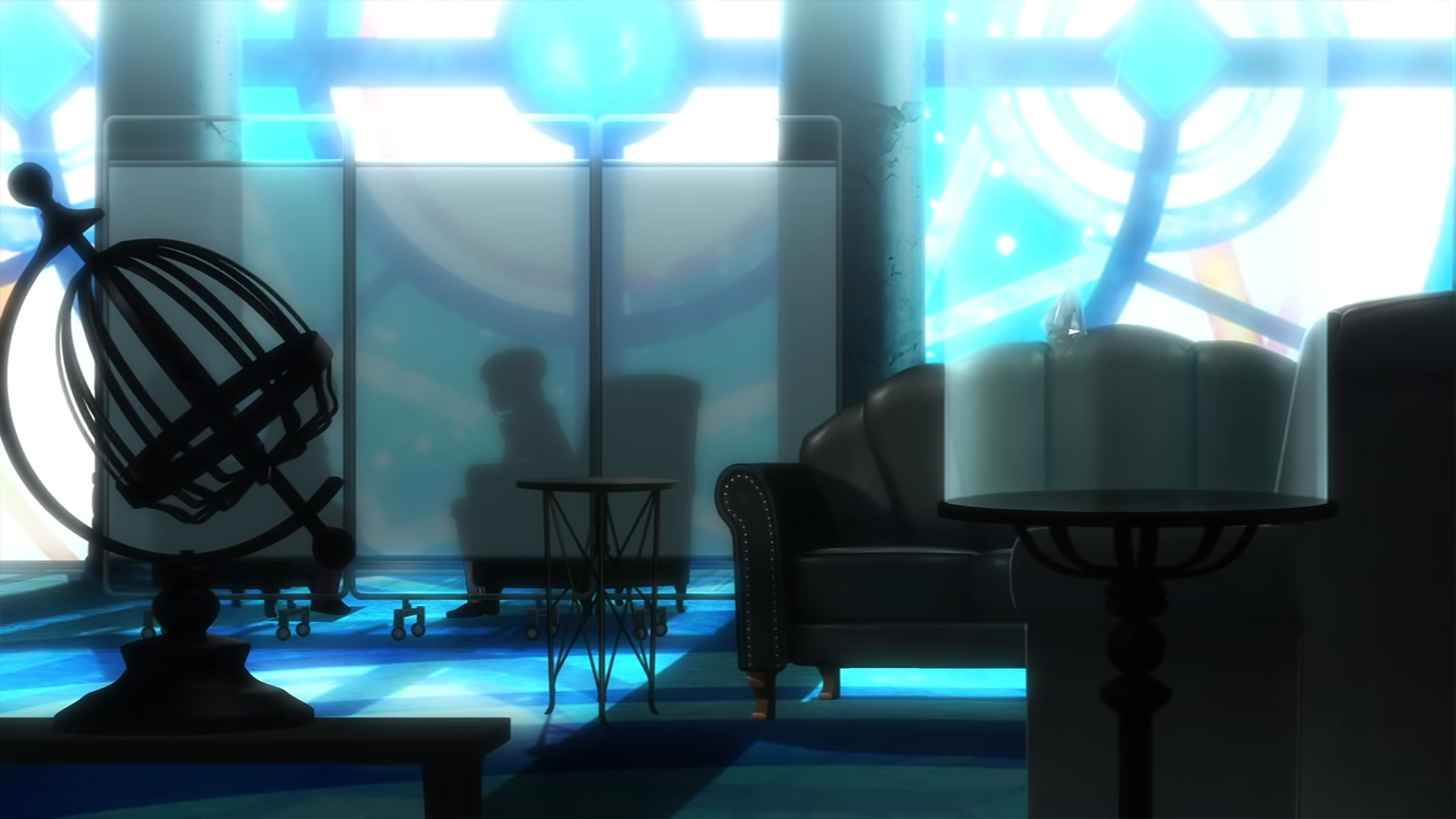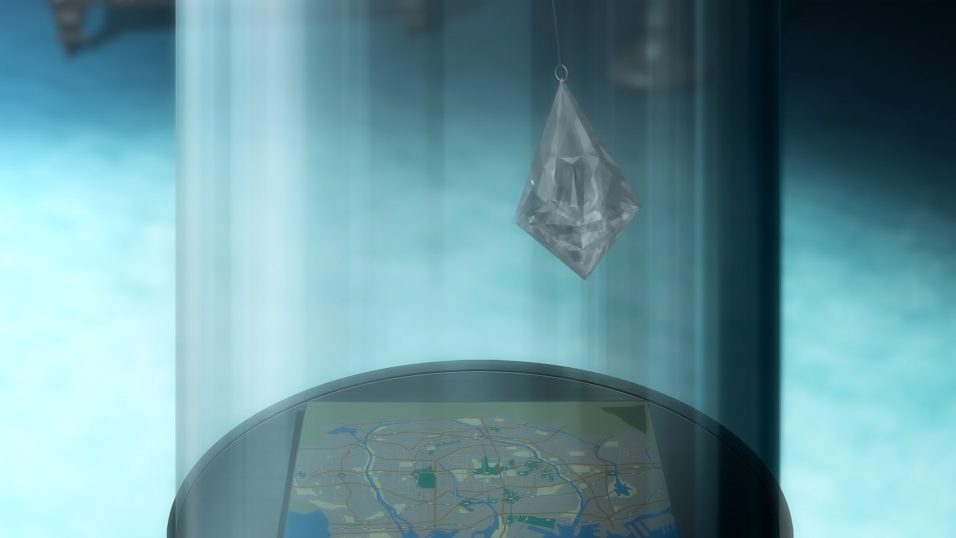 またその直後、神浜市の地図と吊されたダイヤ(?)が美術館にあるような円筒形のガラスケースに納められている画が写りますが、これも調整屋の部屋のインテリアです。神浜市の地図があることから、何かしらの暗示を表現しているのかもしれませんが、少なくとも直接的に物語の根幹に関わってくるアイテムではないと思います。なお、これは同じ第2弾PVの 1:40 にも写っています。