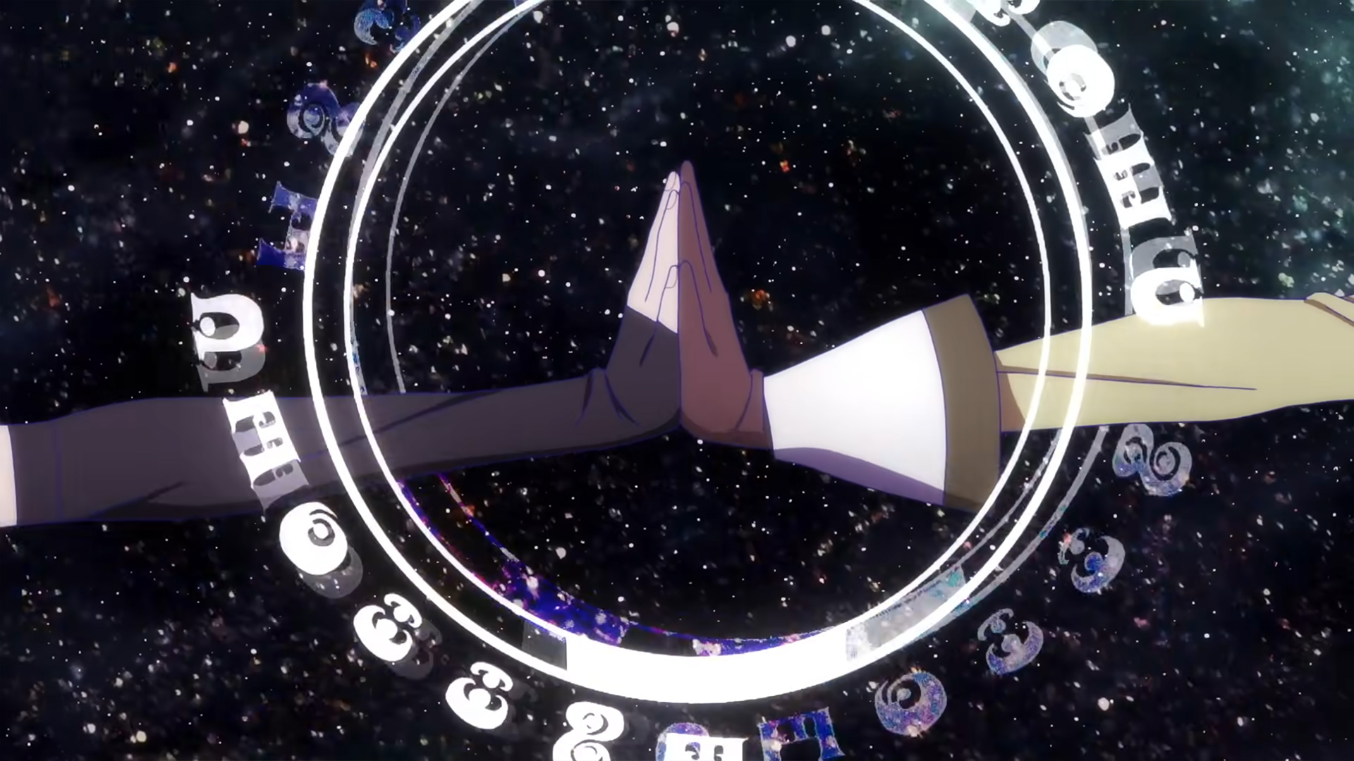 レナとももこが手のひらを合わせて魔法的なエフェクトが出現するカット。これは第2話の冒頭、「Rebecca(羊の魔女)」戦での2人の共闘シーンです。ここでは魔女文字が書かれており、ニューヨークでの上映時は一瞬のことで読み取れませんでしたが、PV映像で「Connect」と書かれていることが判明しました。