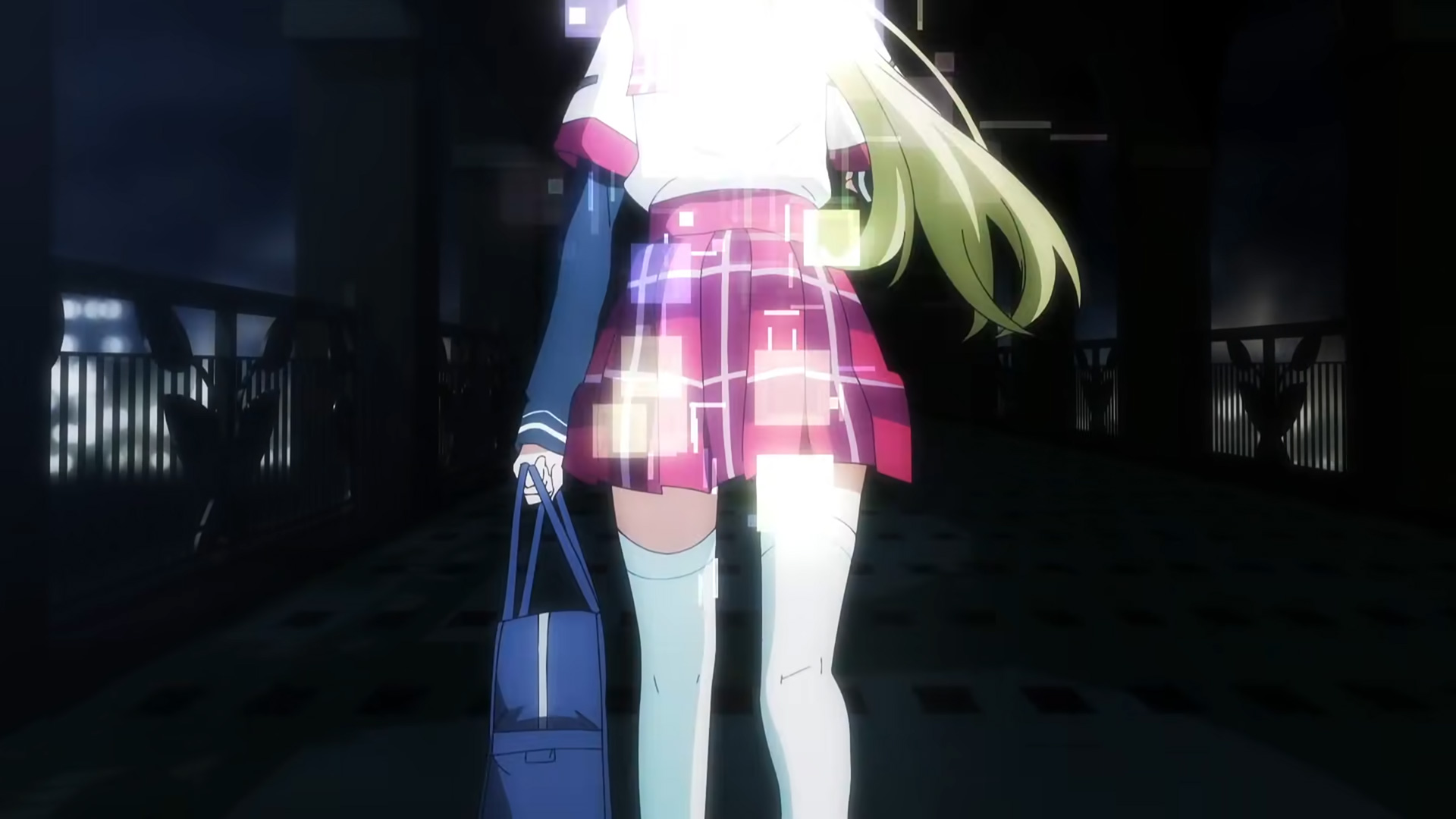 調整屋のパーティション越しに2人が話し込んでいる(?)カットはこれまでの上映で見ていないので、第3話ダイジェスト版に含まれなかったシーンか、第4話以降となります。向かって右側の人は帽子を被っているように見え、一見アリナかと思いましたが、足下を見ると白いソックスを履いていることから制服姿と思われますし、なによりアリナの帽子にあるつばが描かれていません。制服姿の帽子キャラといえば灯花の可能性がありそうですが、それにしては背が高い気が……。果たして誰なのでしょうか。
