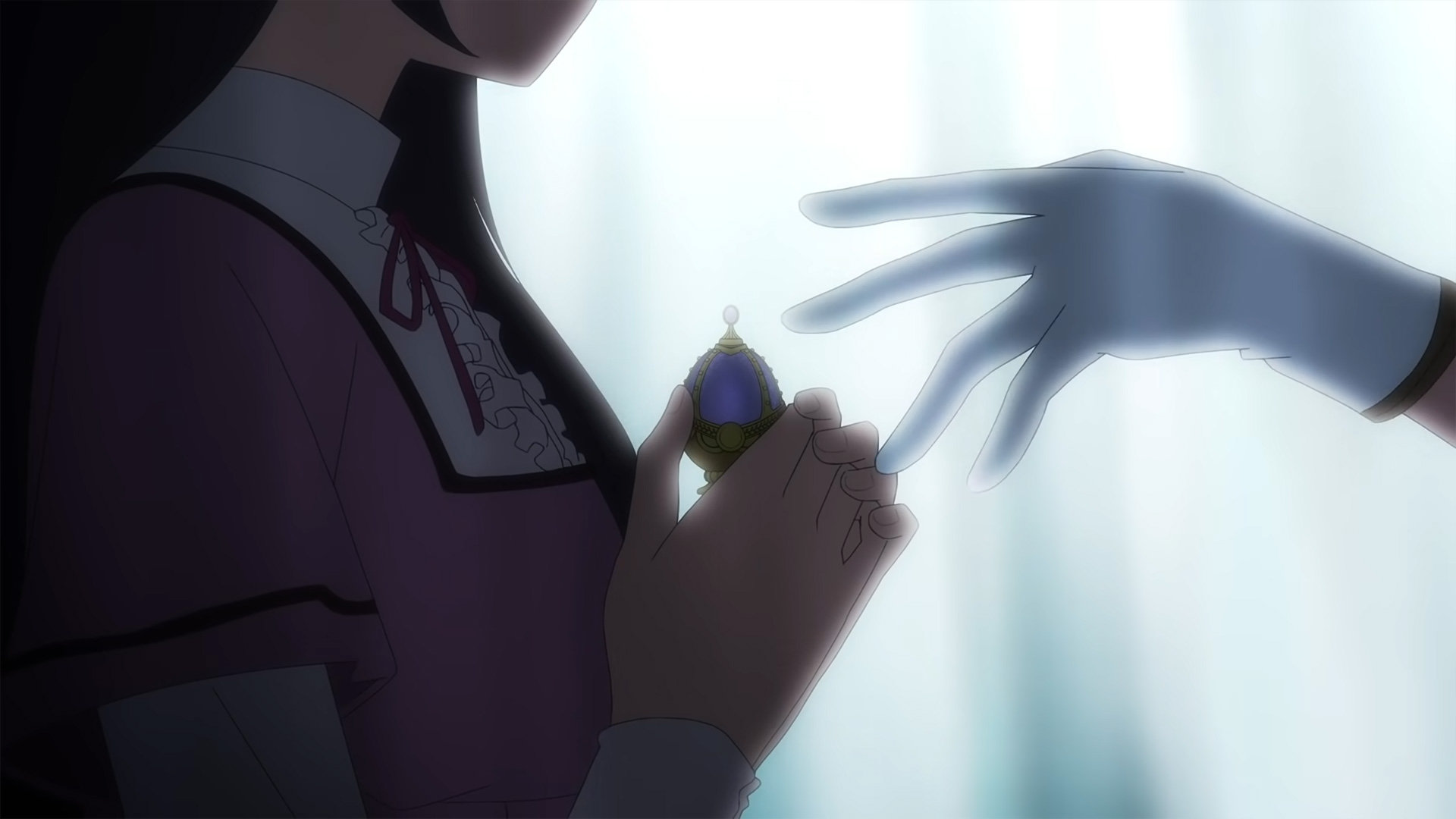 みたまが水名女学園の制服を着た生徒のソウルジェムに触れるカットはおそらく第3話かと思われます。ニューヨークで上映された第3話ダイジェスト版では、顔は分からないものの黒髪ロングの子が調整屋にいるカットがあったので、それに関連したシーンの可能性が考えられます。水名女学園で黒髪ロングの生徒といえば月夜か麻友が思い浮かびますが、ソウルジェムが紫色なので別の少女なのかもしれません。