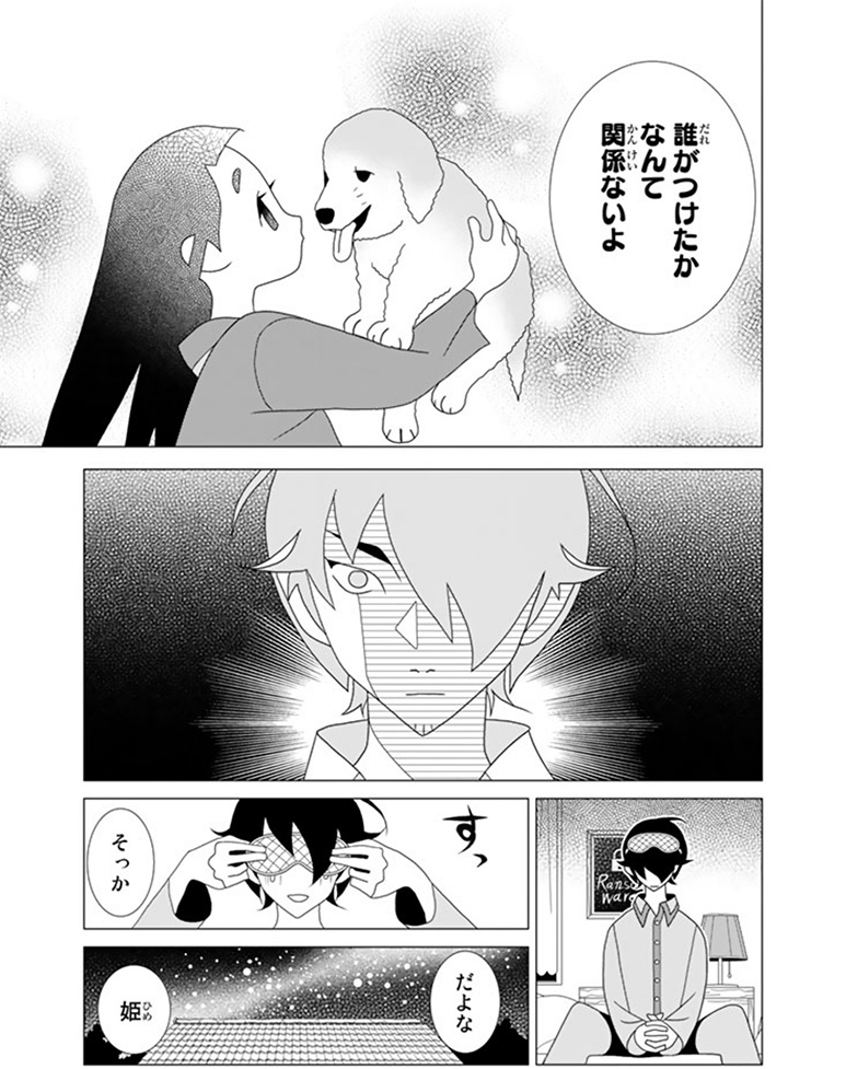 第5巻「全とっかえ役人共」で飼い犬に「ロク」と命名した話で、姫が「いい名前なら 誰がつけたかなんて関係ないよ」と言った際、可久士が泣くシーンがあります。普段の可久士なら「そうだよな」と優しく微笑みそうに思えるのですが、ここで泣いたのは過去に姫の名付けに関して何かしらの出来事があったのではないかと推察されます。