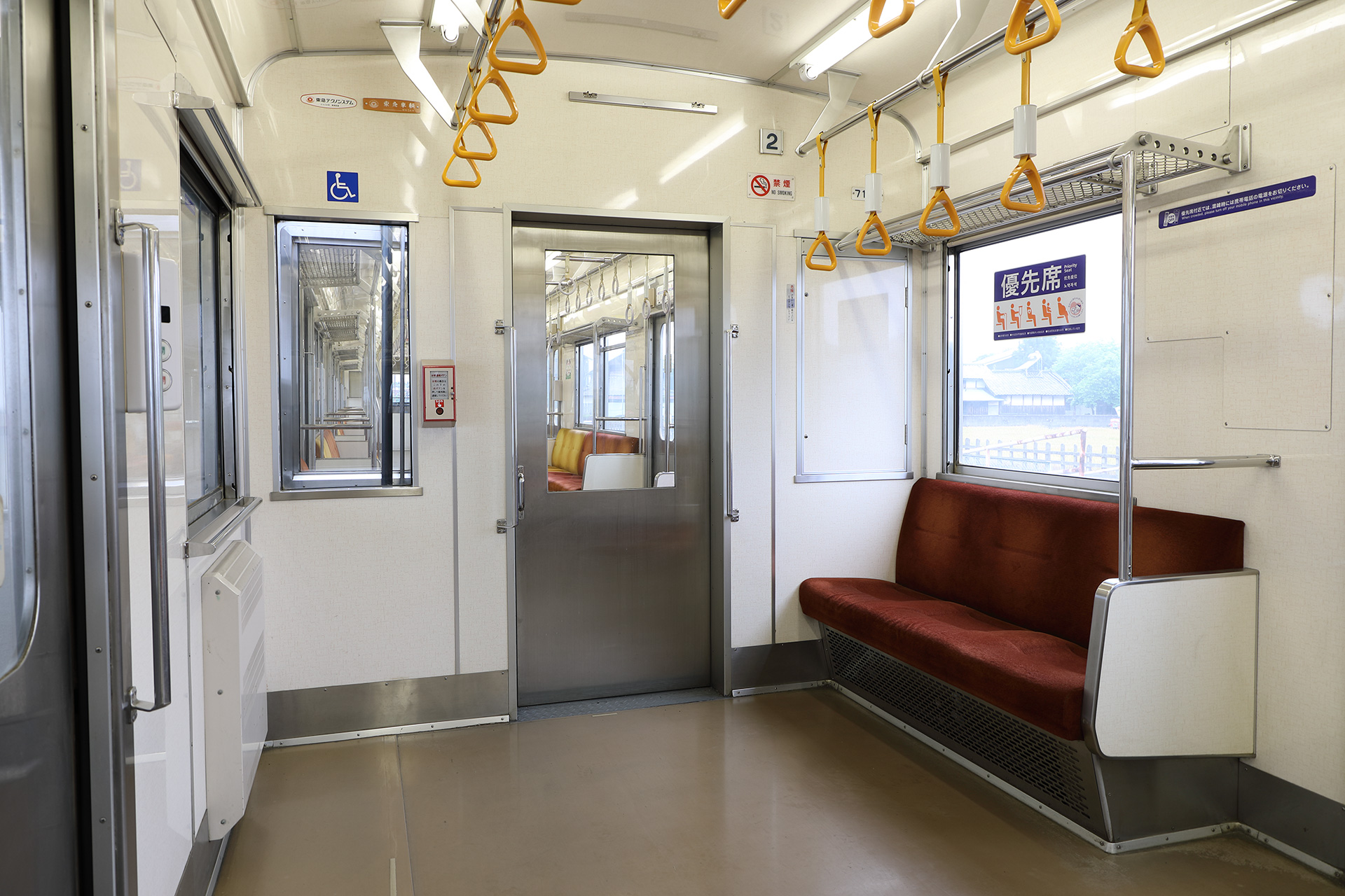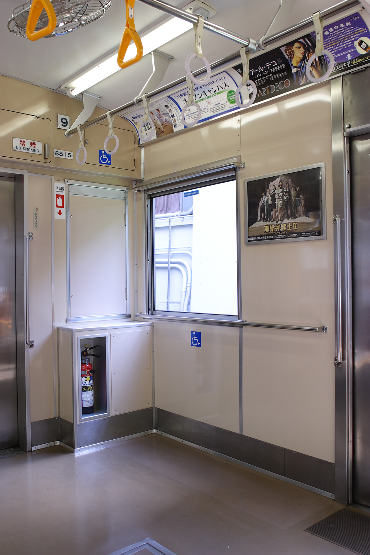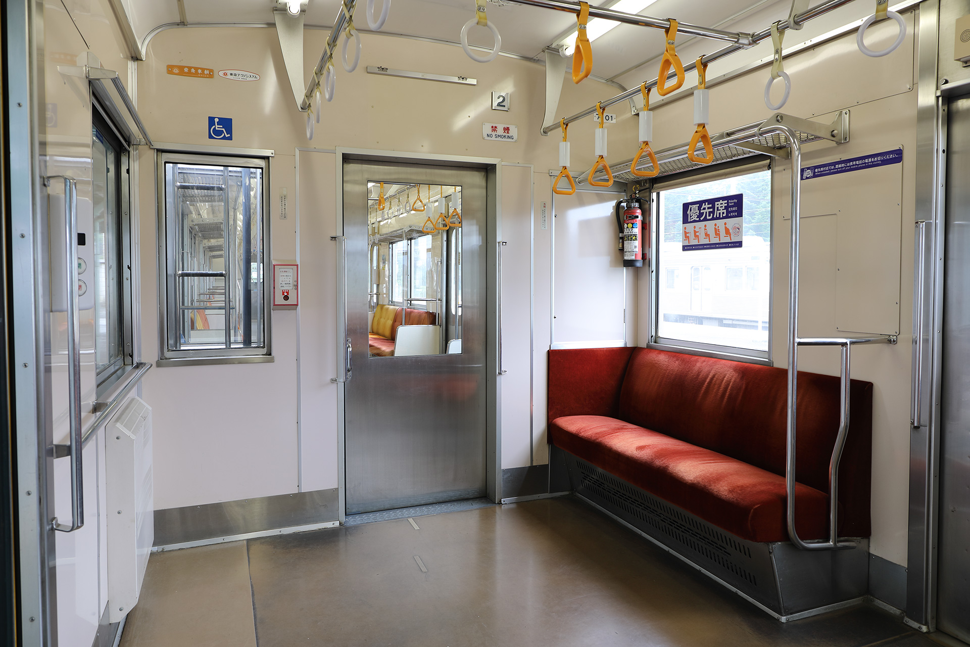 上記とは別に、車体更新車のうち改造工事が後期に行われた車両は、消火器が壁掛け(頭上)から座席脇(足元)へ移設され、その設置位置も下り方に集約されました(先頭車は1本が乗務員室設置なのは変わらずなので、上り向きのデハ8600形は下り方海側、下り向きデハ8500形は上り方山側のみ)。