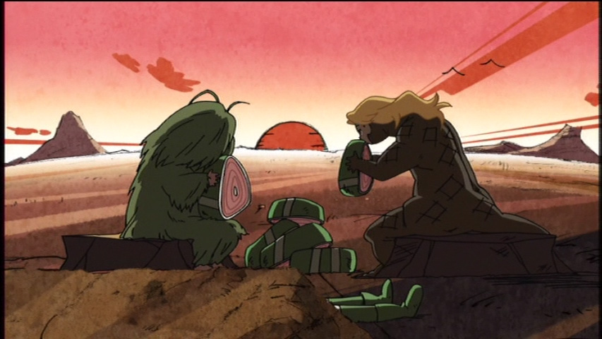 このエピソードでは登場する怪獣がカットによって変わっており、最初の授業シーンにいなかったカエレがマンモス狩りでしれっと合流したかと思いきや、戦闘に参加していない奈美が天に召された一方で千里は死んでおらず、さらに死んだはずのカエレがラストシーンで肉を食っているという、いろいろ矛盾したものになっているのですが、絵コンテ段階でも死んで天に行く人数6〜7人 数合わない