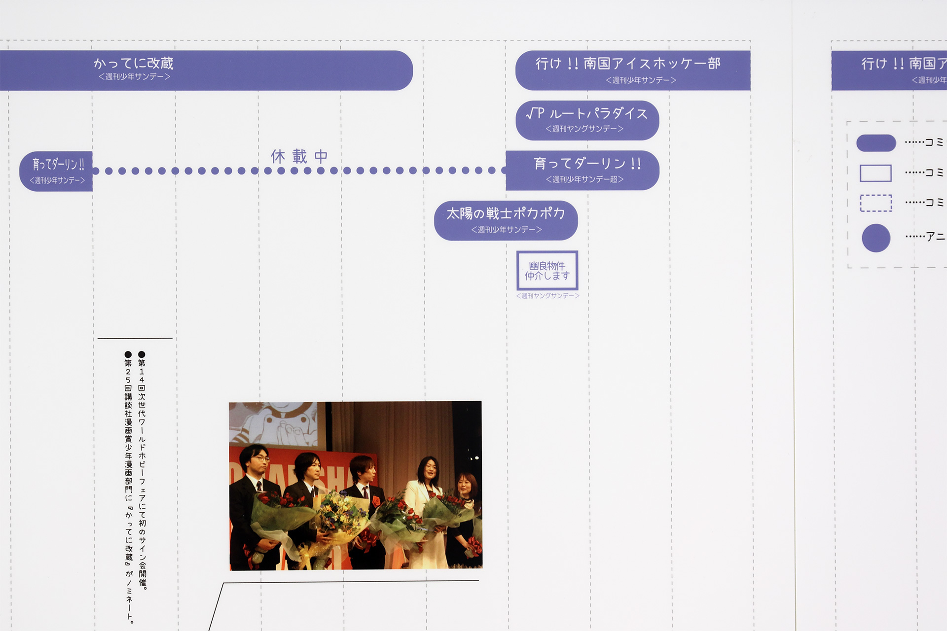 もし初めて賞を取ったことをもって画業開始としているのなら「本当は33周年」になりそうですが、さすがにそんなミスはしないだろうとは思うので、やはり実際に連載を勝ち取った『行け!!南国アイスホッケー部』の入選が基準なのでしょうかね。どちらにしても、連載が開始された年(1991年)ではないということには注意したいところです。