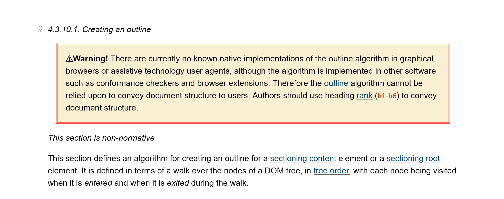HTML 仕様のアウトラインアルゴリズムが現実に即していないことは前々から言われていましたが、この PR が取り込まれればやっと……といったところでしょう。