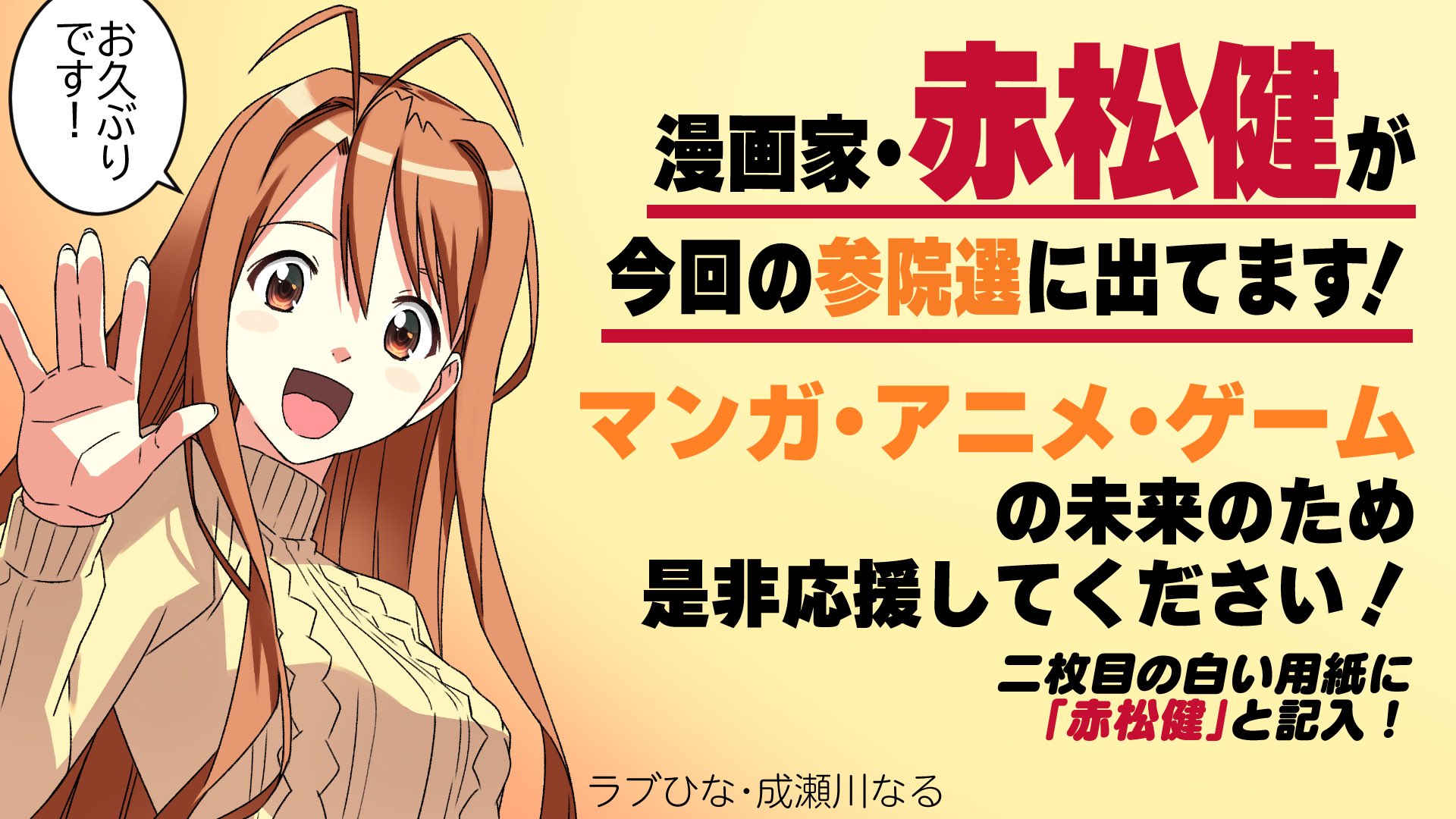 赤松先生は今回の立候補に際して連載していた漫画を今年の初めに完結し、現在は執筆作業を行っていませんが、漫画家を引退したわけではありません。最近 AV 新法が現場の声をほとんど聞かずに成立したため、本来それによって守られるべき当事者自信が困惑している話を耳にしますが、漫画業界でも同じように当事者不在での立法整備があり、赤松先生や山田太郎さん(現・参議院議員、当時は候補者)をはじめとする方々の尽力で差し戻したことがありました。こういう事例が続くと当事者自身が国会議員である必要性を感じます。