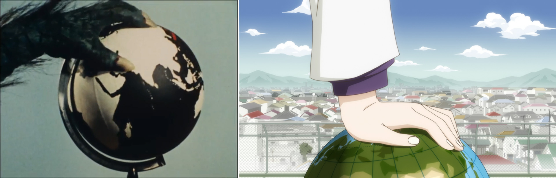 また怪人シーンと挿入位置が前後しますが、地球儀が出てくるのも明らかにオマージュでしょう。ただし『仮面ライダー』では止まっている地球儀を怪人が回そうとするのに対し、『かってに改蔵』では回転している状態から押さえて停止させる違いがあります。これについてはショッカーは悪の秘密結社である一方、科特部は全くそうではないため、オマージュをするにしても原作漫画におけるキャラクターの立ち位置を尊重し、あえて逆の演出を行ったのではないかと個人的に考えています。