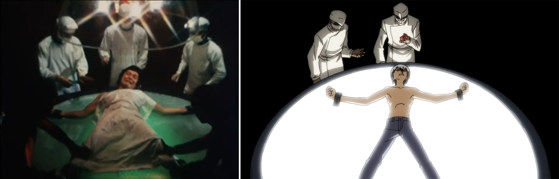 さて、14話「魔人サボテグロンの襲来」では仮面ライダーが本郷猛から一文字隼人に交代したことでオープニング映像も全面的に差し替えられます。しかし劇中で交代の事実が語られるのは14話の本編内であり、14話のオープニング時点では視聴者は交代の事実を知らないためか間奏ナレーションはなく、次の15話「逆襲サボテグロン」で名前を差し替える形でナレーションが復活します。この時、映像も14話バージョンを元にナレーションが始まるタイミングの1か所のみ差し替えられ、ショッカーの基地内で改造手術を受けるカットが新規登場します。