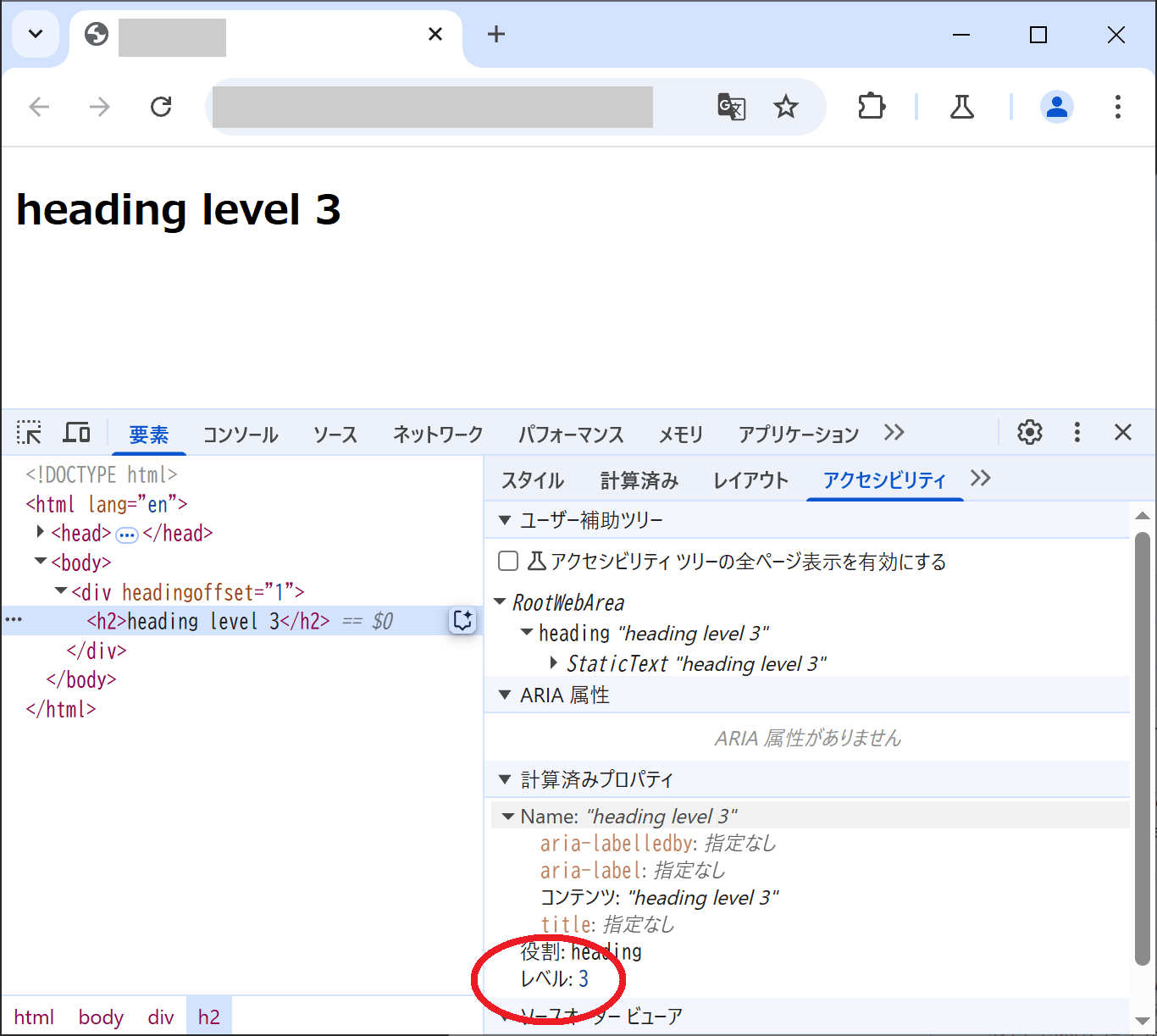 body > div[headingoffset=1] > h2 な見出し要素を選択した様子。アクセシビリティパネルの計算済みプロパティにはレベル: 3と表示されている。
