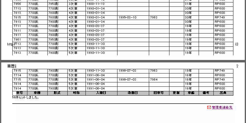 まずは、表フッタを表本体の前に書いた場合の印刷プレビュー。グレーな背景の行が表フッタなのですが、表の後に続く部分(この例では「56件ヒットしました。」という文章)も含めて、表本体と重なってしまっています。