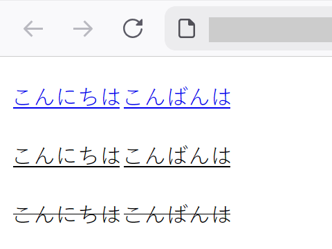 たとえば次の HTML を表示した場合、これまでは横線が連続して見た目上の区切りが判別できなかったのですが、対応ブラウザでは text-decoration-inset: auto を指定した場合、良い感じに分離されるようになります。