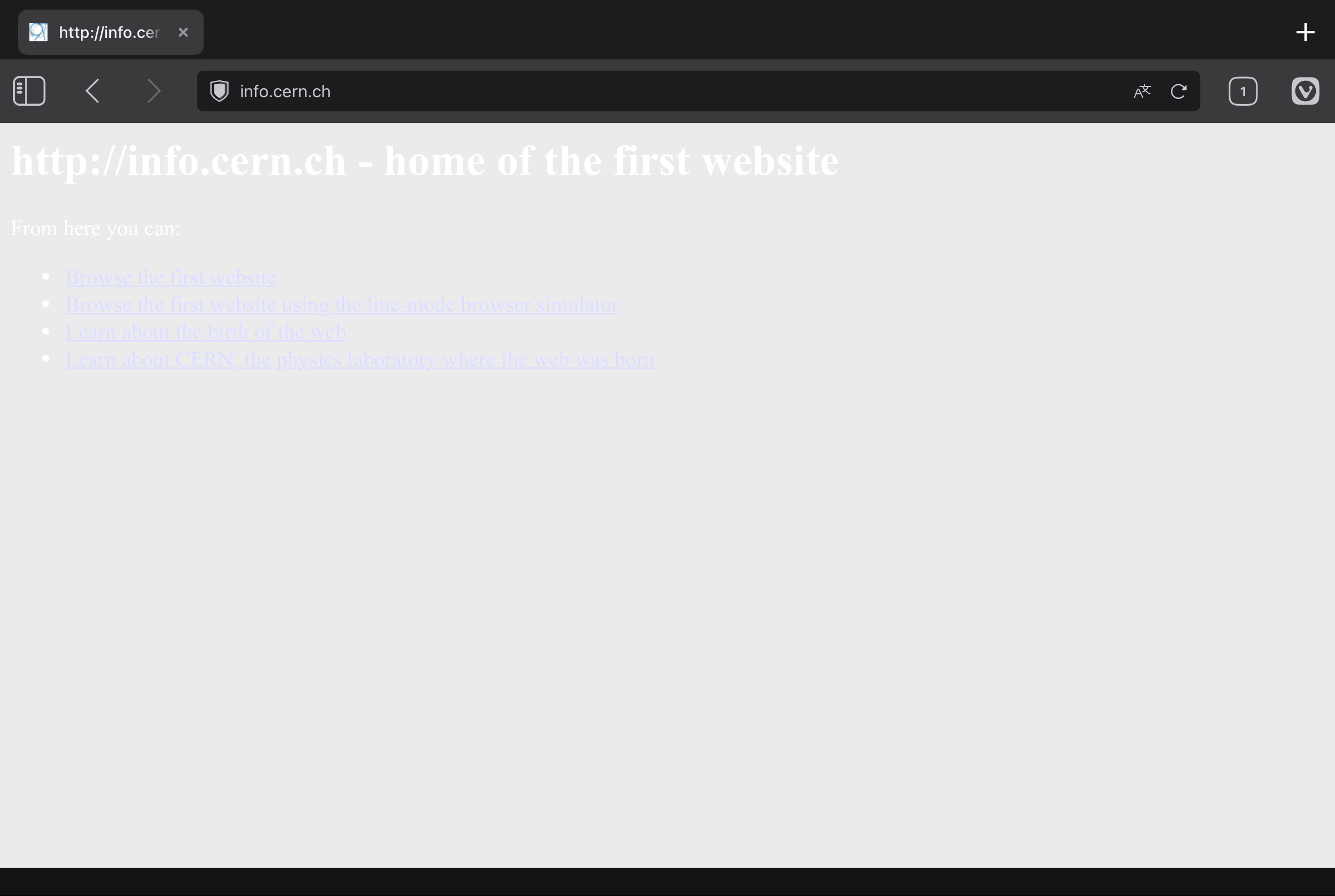 info.cern.ch を iOS 版 Vivaldi(強制ダークテーマ適用)で表示した様子そういった意味からも、Vivaldi には早急にこのバグを修正して欲しいと思います(※すでにバグレポートは提出済みです)。