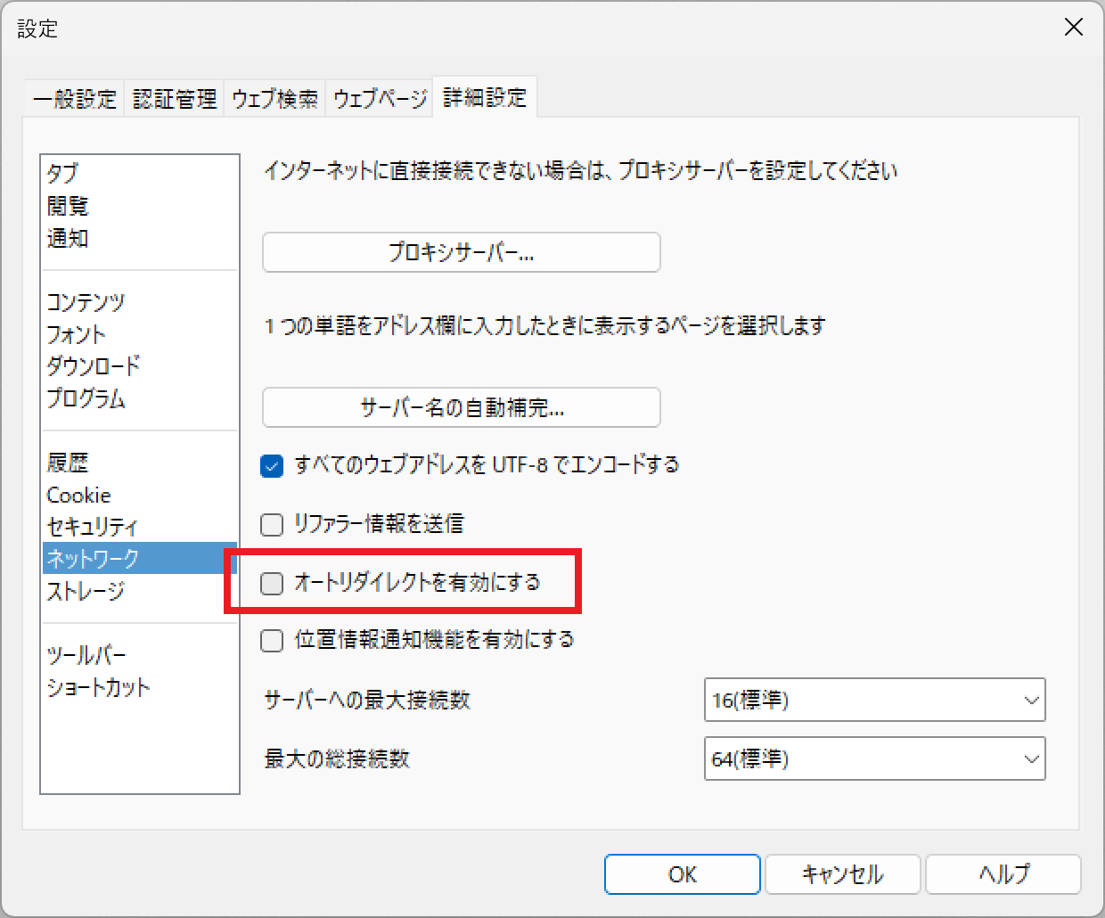 「設定」–「詳細設定」–「ネットワーク」の中にオートリダイレクトを有効にする