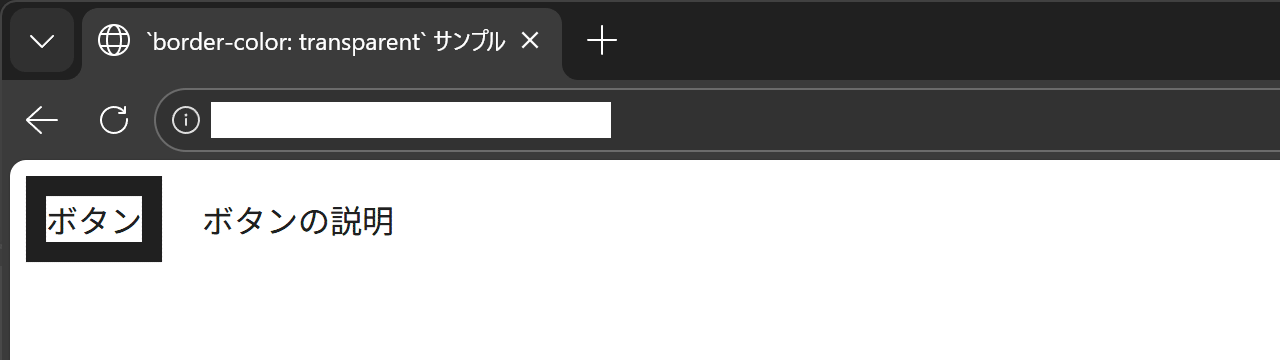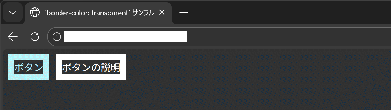 border: 10px solid transparent が設定されたコンポーネントを Edge 144 で閲覧した様子。ボタンのみに枠線が表示、テキストの下端位置は揃っている。しかし強制ダークテーマを備えたブラウザのうち、Edge(ページの色)や Firefox(コントラスト制御)では transparent 時の罫線も表示される事象があります。本例の場合、単なる説明文に過ぎない .description も枠線が表示されることで、色違いのボタンが2つ並んでいると誤認されてしまいます。
