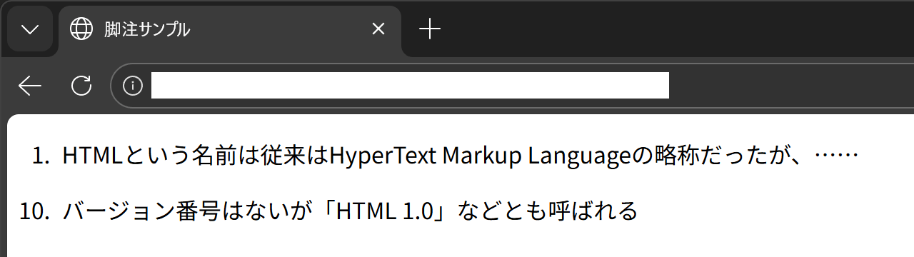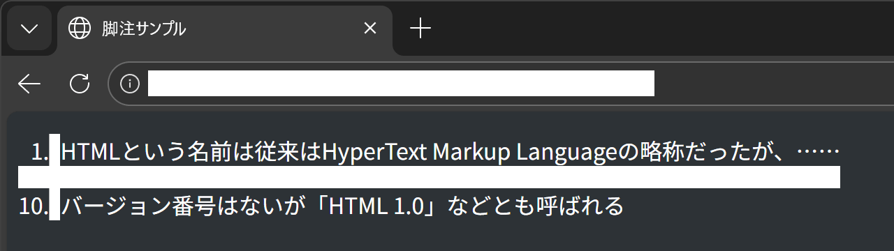 display: table による脚注コード を Edge 144 で閲覧した様子。脚注同士は一行分の間隔が空いている。しかし前述のとおり、強制ダークテーマでは透明なはずの罫線が見えてしまう事象が起こります。