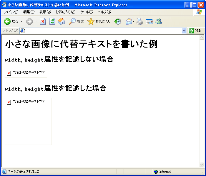 width / height 属性を記述しない場合は代替テキストが表示されているが、両属性を記述した場合は枠線とアイコンによりそこに画像があることのみ判別でき、代替テキストは表示されない。width / height 属性の記述の有無に関わらず代替テキストが画面に表示されている。IE 6 は正常に表示されていることが分かりますが、さらに小さな画像だと IE もやはり切れてしまっていました。前述のように当時の width / height 属性の役割は「画像リソース取得前にそのスペースを予約しておくこと」だったため、代替テキストの表示と相性が悪かったと言えます。