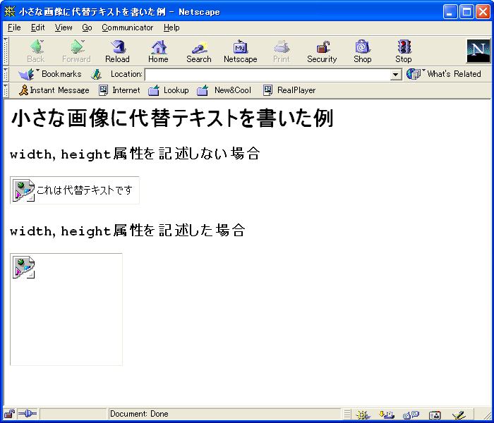 もうひとつの理由はブラウザの描画です。小さな画像に width / height 属性を書くと、画像が表示されない場合(代替テキストが表示される場合)に alt 属性値が切れてしまう現象がありました。160×160px の画像に対して width / height 属性を記述しない場合・した場合それぞれのケースを Netscape Communicator 4.73 と Internet Explorer 6 で表示した様子を以下に示します。
